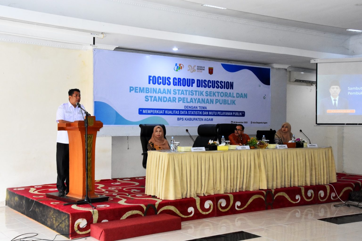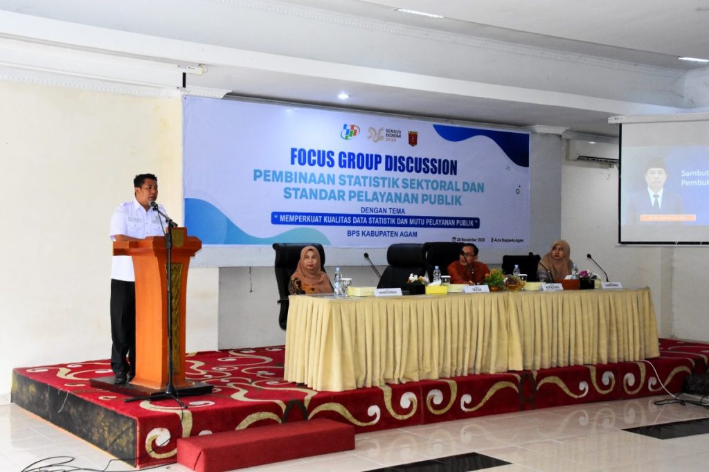 Agam, isuenasional.com — Pemerintah Kabupaten Agam menegaskan komitmennya untuk memperkuat tata kelola data dan meningkatkan kualitas layanan publik. Penegasan tersebut disampaikan Sekretaris Daerah Kabupaten Agam, Mhd Lutfi AR, saat membuka Focus Group Discussion (FGD) dan Pembinaan Statistik Sektoral serta Standar Pelayanan Publik, yang digelar BPS Kabupaten Agam di Aula Bappeda, Rabu (26/11/2025).
