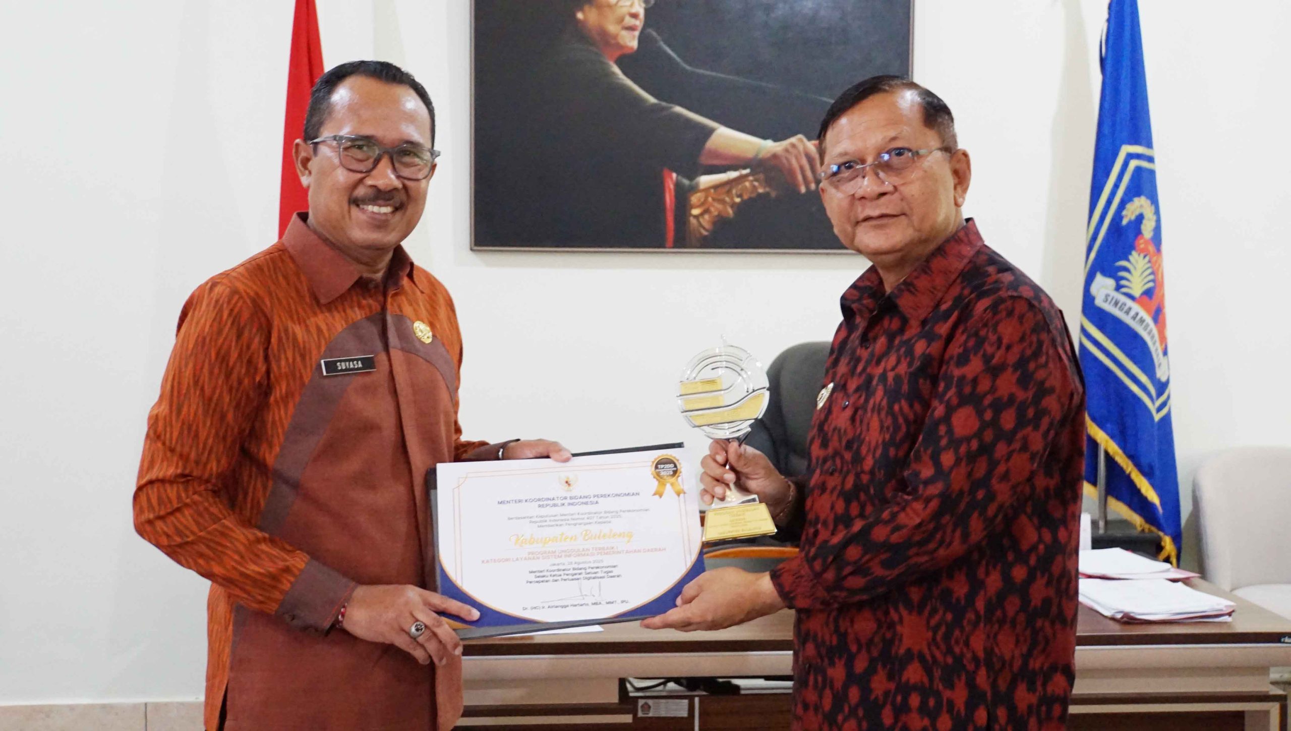 Buleleng, isuenasional.com – Pemerintah Kabupaten Buleleng kembali menorehkan prestasi nasional setelah meraih peringkat Terbaik I Program Unggulan Layanan Sistem Informasi Pemerintahan Daerah (SIPD) tahun 2025. Penghargaan yang diberikan Kementerian Koordinator Perekonomian RI ini diberikan atas keberhasilan Buleleng menjalankan Sistem Pemerintah Berbasis Elektronik di seluruh SKPD. Penyerahan piala dan sertifikat dilakukan secara resmi di Rumah Jabatan Bupati Buleleng pada Rabu (10/12/2025), diserahkan Sekretaris Daerah Gede Suyasa kepada Bupati I Nyoman Sutjidra.