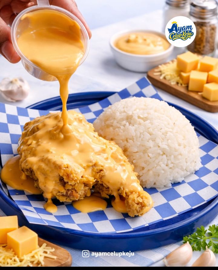 Ayam Celup Keju: Ayam renyah dengan baluran saus keju creamy yang lumer di mulut.